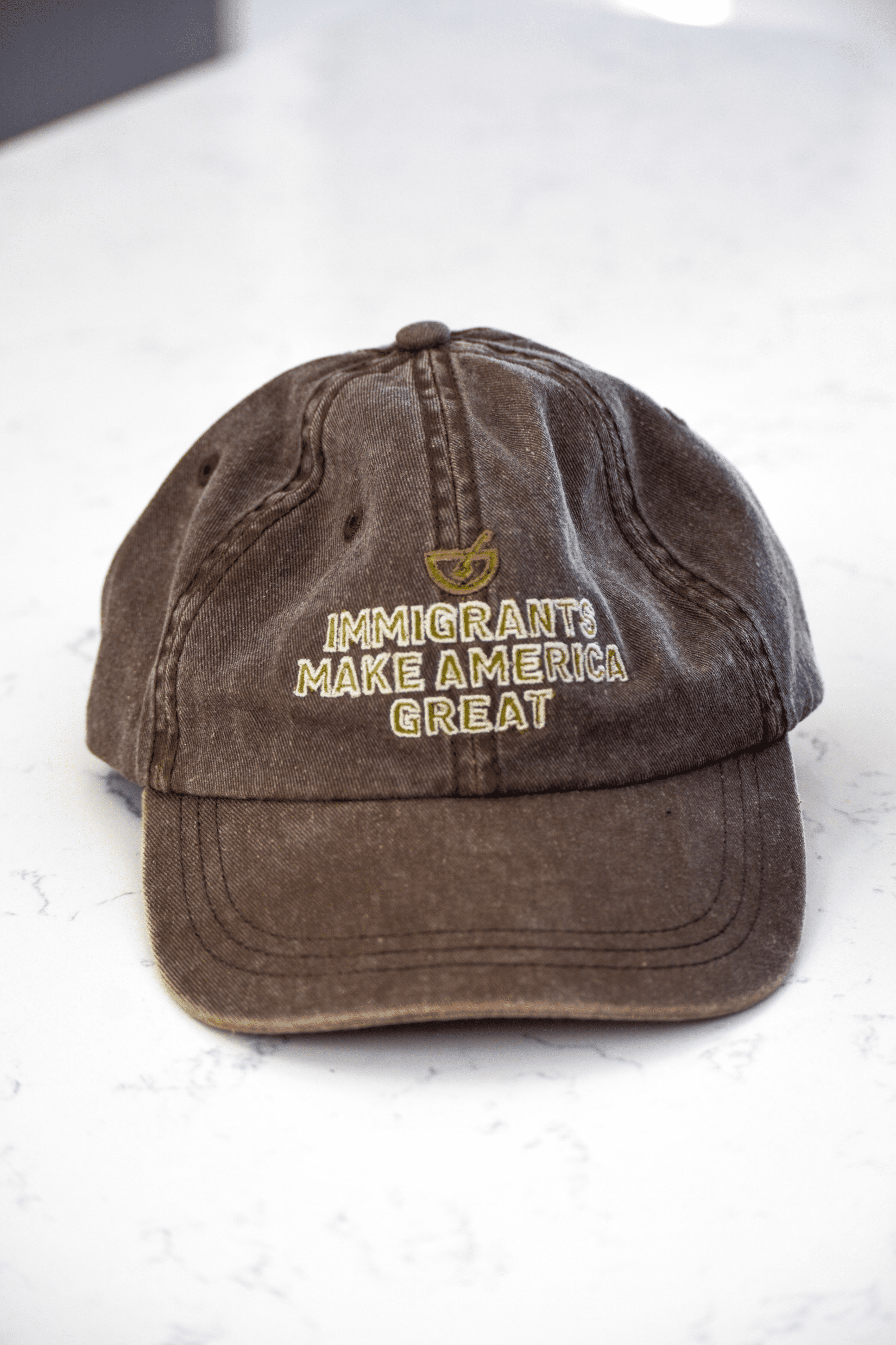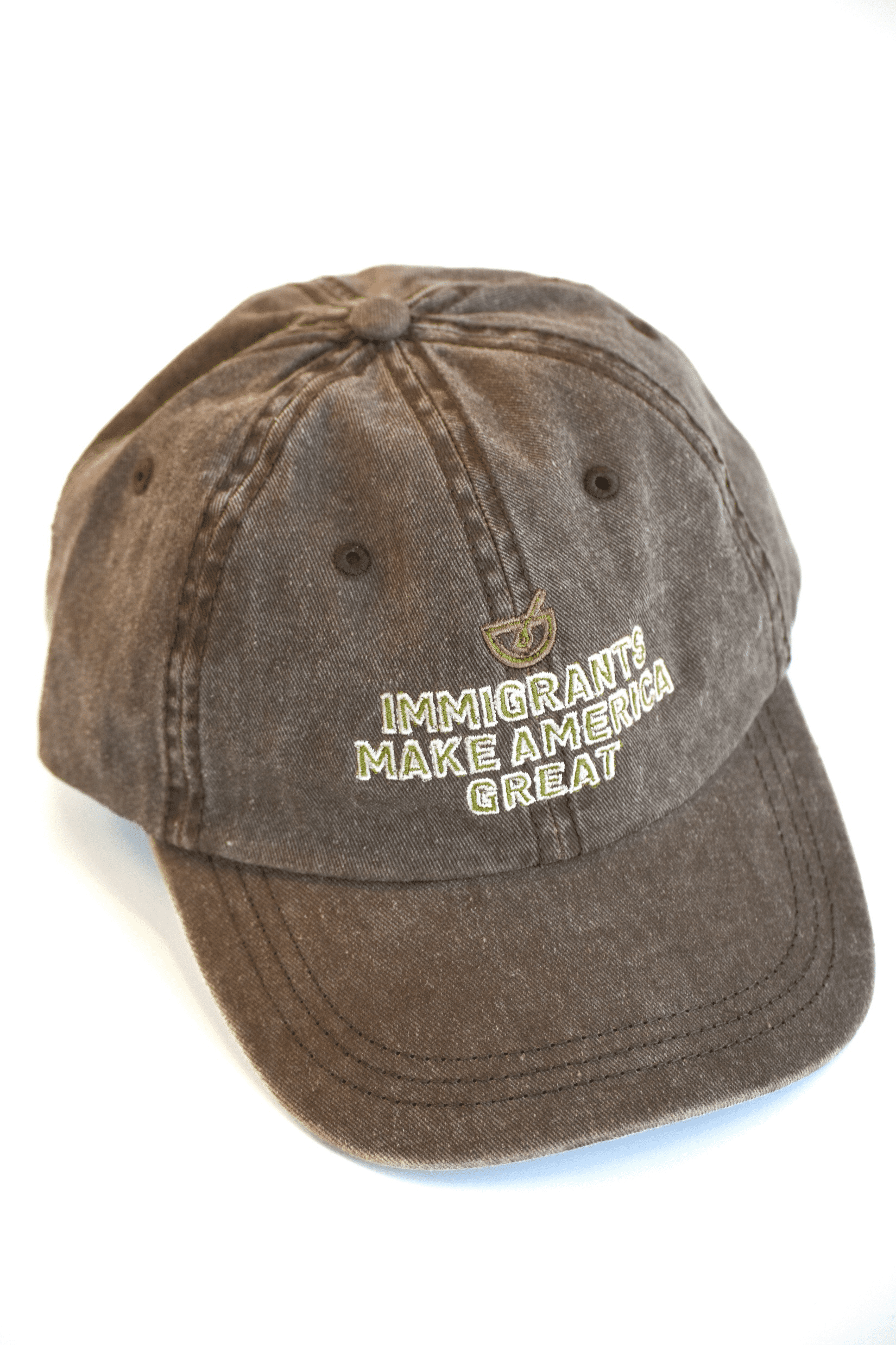 Brown unisex dad hat from that states the obvious – “Immigrants Make America Great”. One size fits all true American patriots.